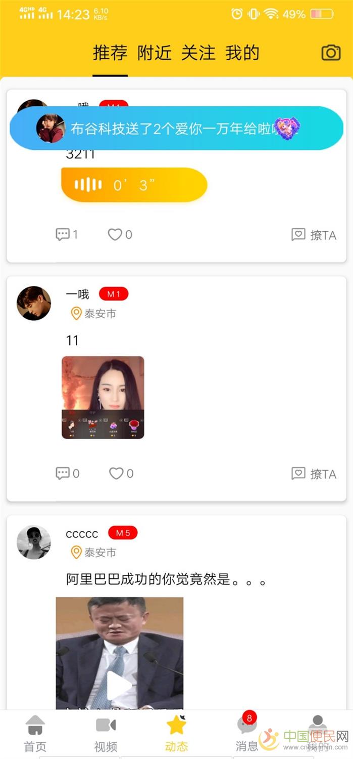 23、用户可以发布动态:含语音、文字、视频、图片,形式多样,动态界面可以和发布者发起一对一私聊cnbianmin.com。